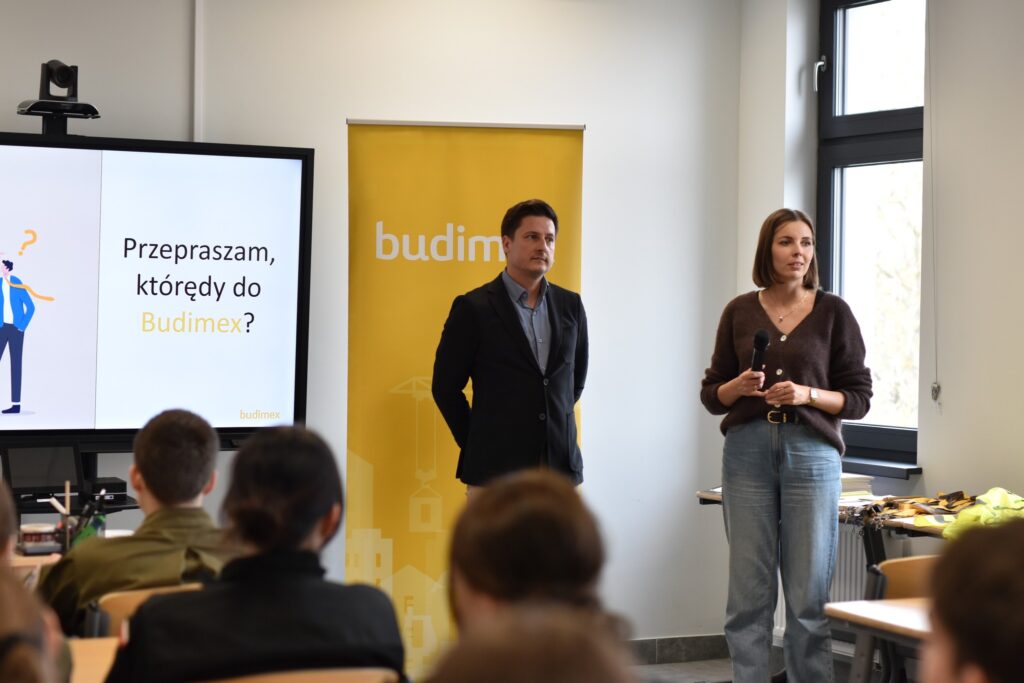 Przedstawiciele Firmy BUDIMEX Pani Daria Pomernacka i Pan Piotr Mandziak przybliżyli uczniom działalność firmy, jej zasięg oraz możliwości jakie oferuje stażystom, praktykantom i pracownikom.