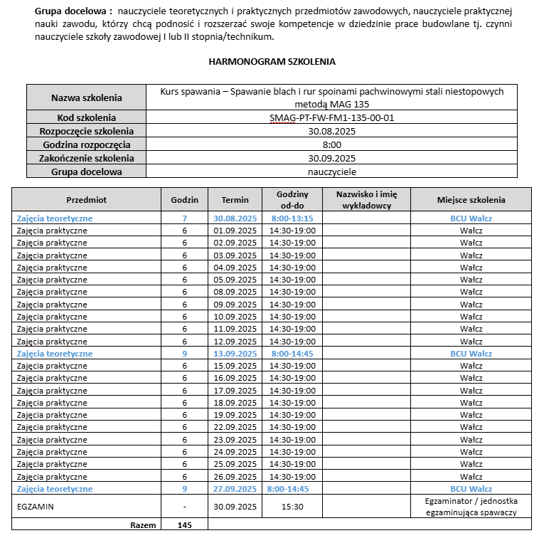 Strona główna » Szkolenia » Dla nauczycieli » Spawanie blach i rur spoinami pachwinowymi stali niestopowych metodą MAG 135 – formularz rekrutacyjny